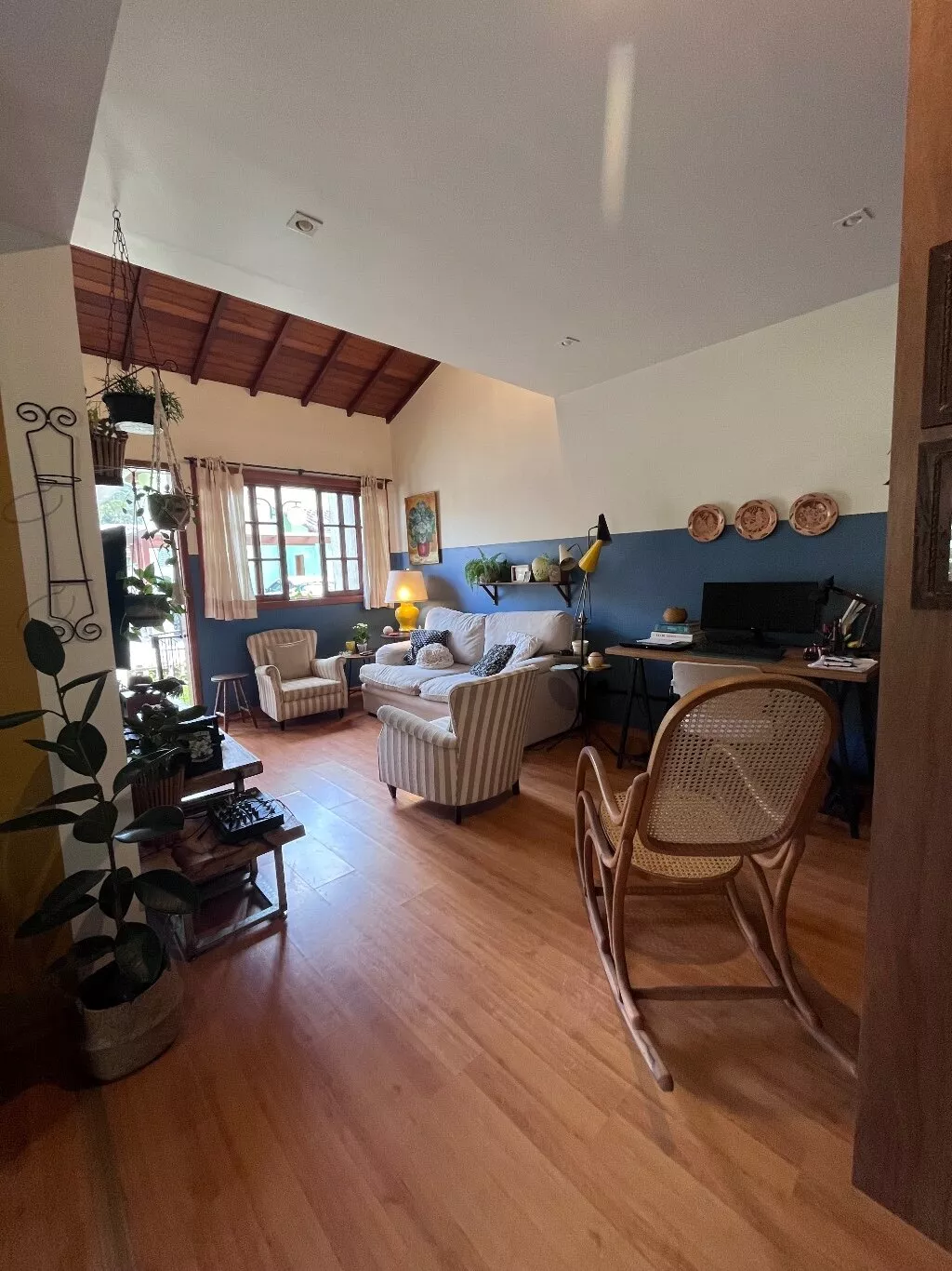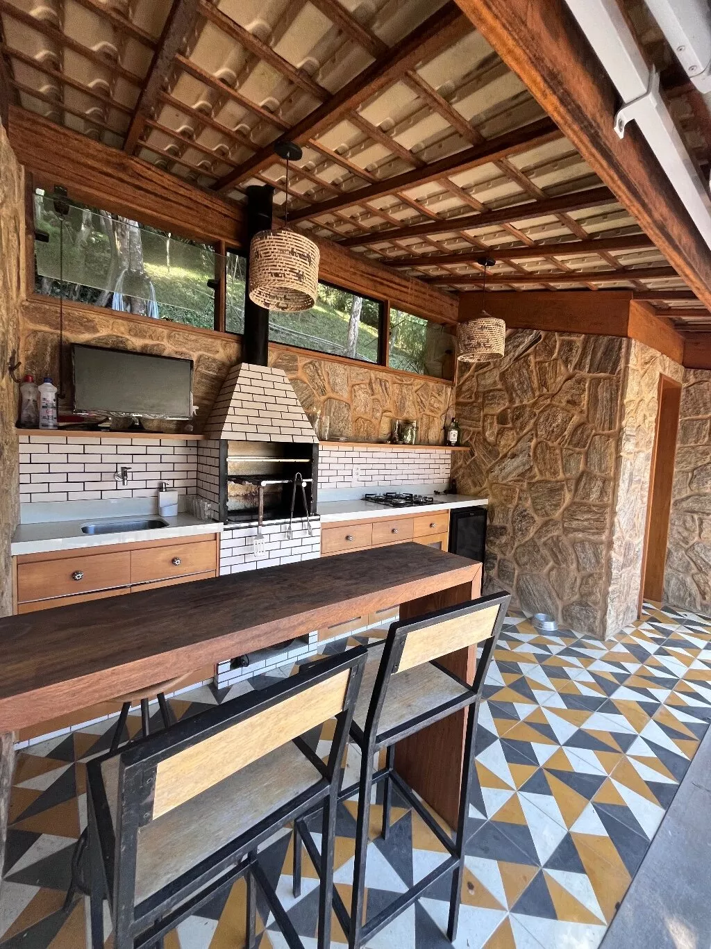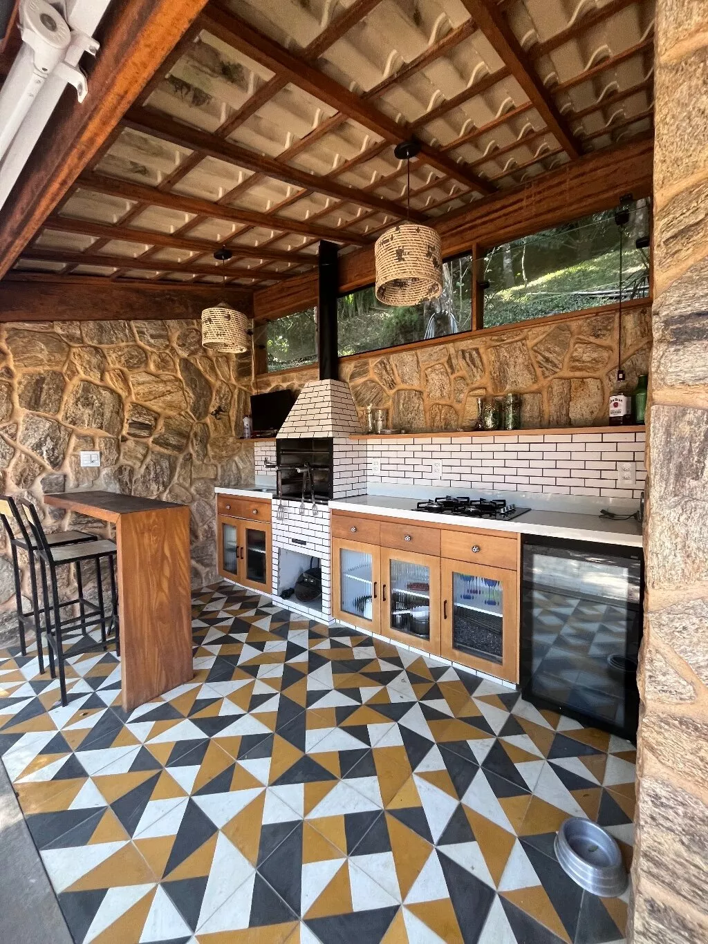Possui 3 quartos, sendo 2 suites no segundo andar e 1 quarto reversível com banheiro comum; cozinha americana, adega e área de serviço fechada. A área externa da casa conta com um belo jardim e área gourmet (churrasqueira e forno a lenha).