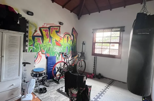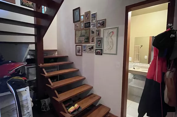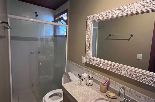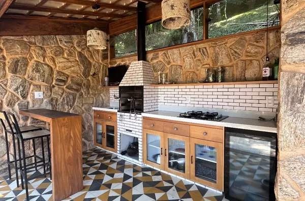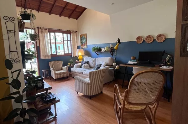 Possui 3 quartos, sendo 2 suites no segundo andar e 1 quarto reversível com banheiro comum; cozinha americana, adega e área de serviço fechada. A área externa da casa conta com um belo jardim e área gourmet (churrasqueira e forno a lenha).